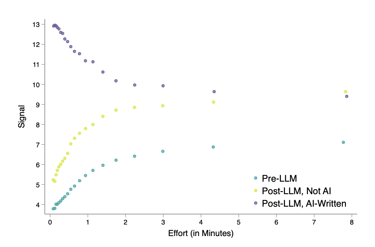 Il grafico mostra la relazione tra sforzo e qualità della candidatura pre/post LLM. Si osserva che per le candidature scritte con AI, la correlazione diventa negativa: meno tempo spendi, migliore risulta la cover letter generata dall'AI