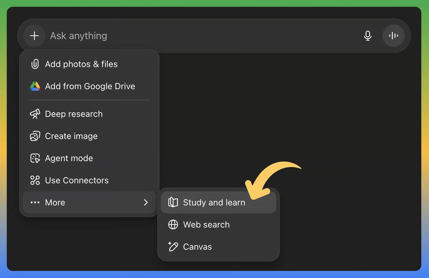 Vai su ChatGPT, seleziona "GPT-5" → clicca su "+" → apri le impostazioni "Altro" → attiva "Studia e impara"